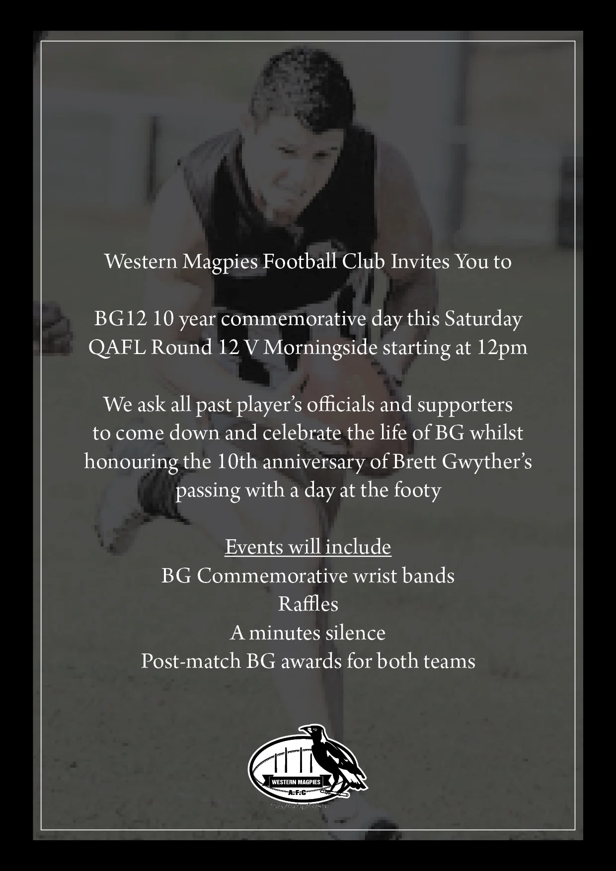 The Western Magpies will be holding “The BG Day” on Saturday July 15th when the Magpies host Morningside in a crucial QAFL encounter at Chelmer.